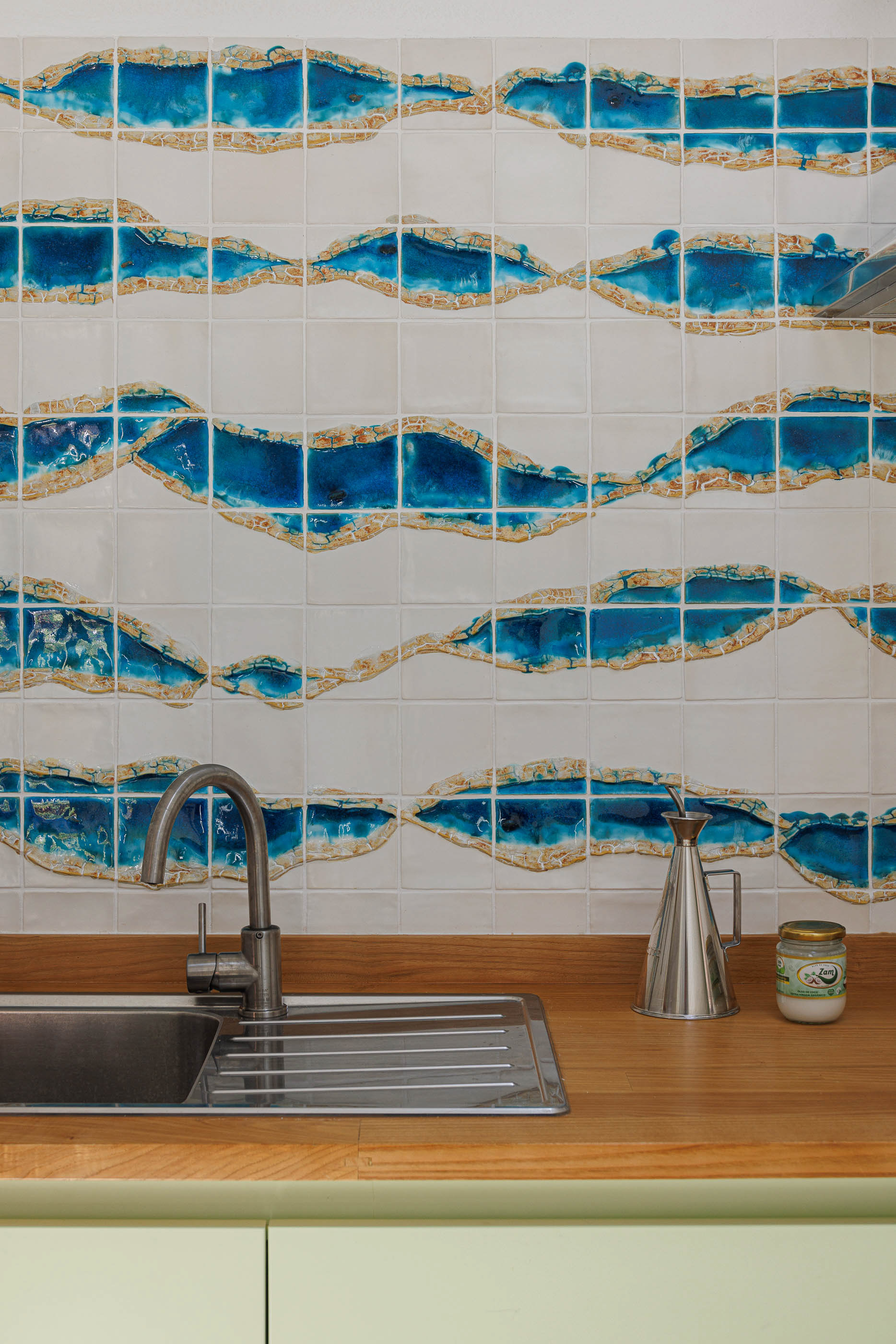 These tile artworks are part of a project by Paulo Moreira Architectures to refurbish a small traditional house in a village in the Serra de Montemuro: a main panel in front of the stairs, two coordinated sets of tiles for the kitchens, and two small panels for the bathrooms.